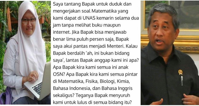 Saya tidak bisa sepenuhnya menyalahkan teman-teman yang terpaksa curang setelah mereka belajar tetapi soal yang keluar seperti itu. Kami mengemban harapan dan angan yang tak sedikit di pundak kami, Pak. Harapan guru. Harapan sekolah. Harapan orangtua. Semakin jujur kami, semakin berat beban itu. Sebelum sampai di gerbang UNAS, kami telah melewati ulangan sekolah, ulangan praktek, dan berbagai ulangan lainnya. Tenaga, biaya, dan pikiran kami sudah banyak terkuras. Tetapi saat kami menggenggam harapan dan doa, apa yang Bapak hadapkan pada kami? Soal-soal yang menurut para penyusunnya sendiri memuat soal OSN. Yang benar saja, Pak. Saya tantang Bapak untuk duduk dan mengerjakan soal Matematika yang kami dapat di UNAS kemarin selama dua jam tanpa melihat buku maupun internet. Jika Bapak bisa menjawab benar lima puluh persen saja, Bapak saya akui pantas menjadi Menteri. Kalau Bapak berdalih 'ah, ini bukan bidang saya', lantas Bapak anggap kami ini apa? Apa Bapak kira kami semua ini anak OSN? Apa Bapak kira kami semua pintar di Matematika, Fisika, Biologi, Kimia, Bahasa Indonesia, dan Bahasa Inggris sekaligus? Teganya Bapak menyuruh kami untuk lulus di semua bidang itu? Sudah sepercaya itukah Bapak pada kecerdasan kami?